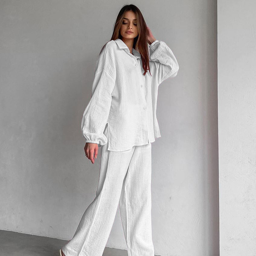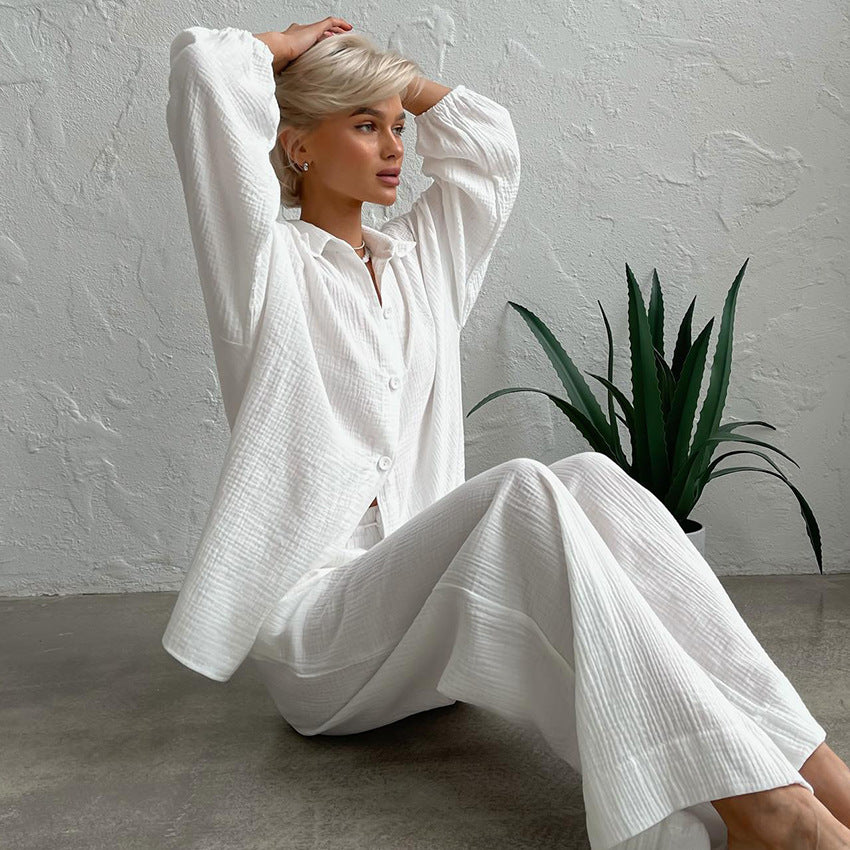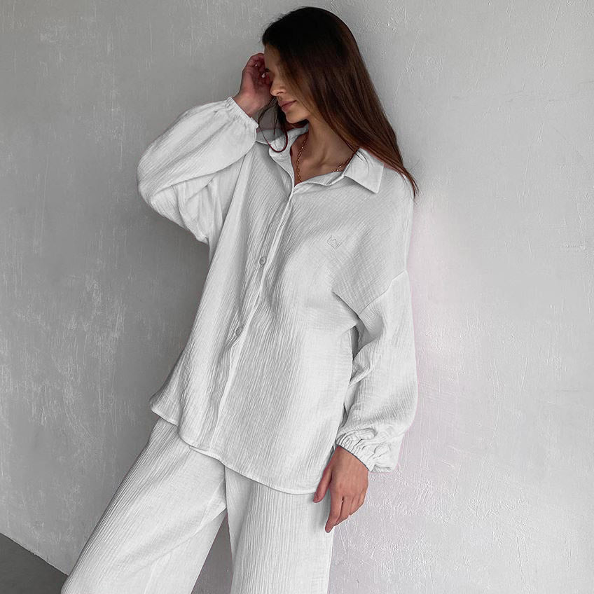 These long-sleeved pajamas with pants embody softness and comfort. Designed to provide an immediate feeling of well-being, they envelop the body in a pleasant-to-the-touch fabric, ideal for cozy evenings or peaceful nights. Their loose fit and careful finishing ensure optimal freedom of movement, while maintaining an elegant look.
